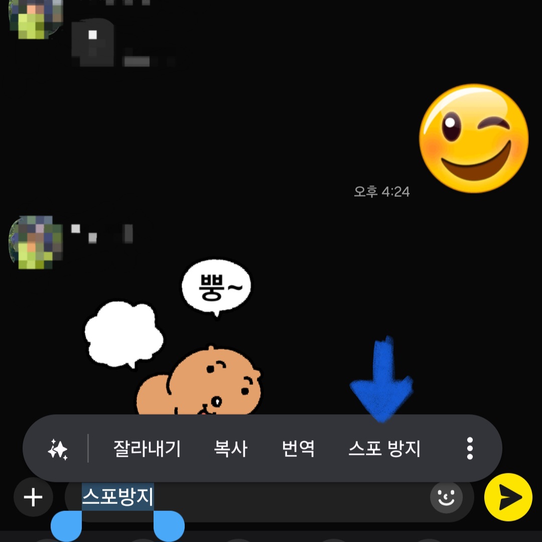 ▼카카오톡 스포방지 기능 사용방법은 간단한데요. 우선 채팅창에 쓰고 싶은 메시지를 입력한 다음 입력한 메시지를 드래그하면 밑에 있는 이미지 사진처럼 "스포 방지"라고 뜨는데요. 그걸 클릭해 주세요.