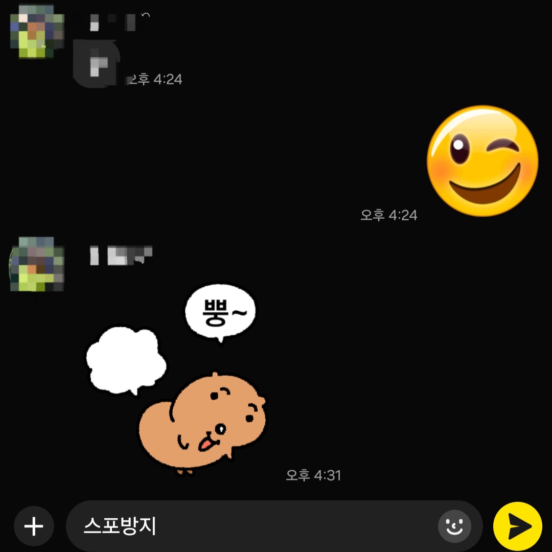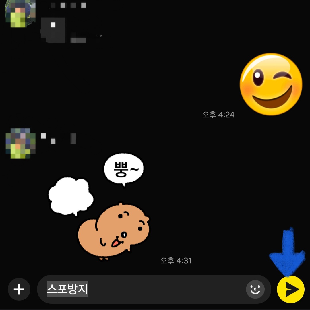 이 기능을 사용하려면 우선 카카오톡을 최신버전으로 업데이트를 해줘야 하는데요. 이 스포방지기능은 오픈채팅방, 일반 채팅방 어디서든 사용가능하지만 글자만 가능하고 사진은 모자이크처리가 불가능하다는 점 참고시길 바라면서 카톡을 잘 안읽은 지인들한테 한번 이용해보세요. 감사합니다.