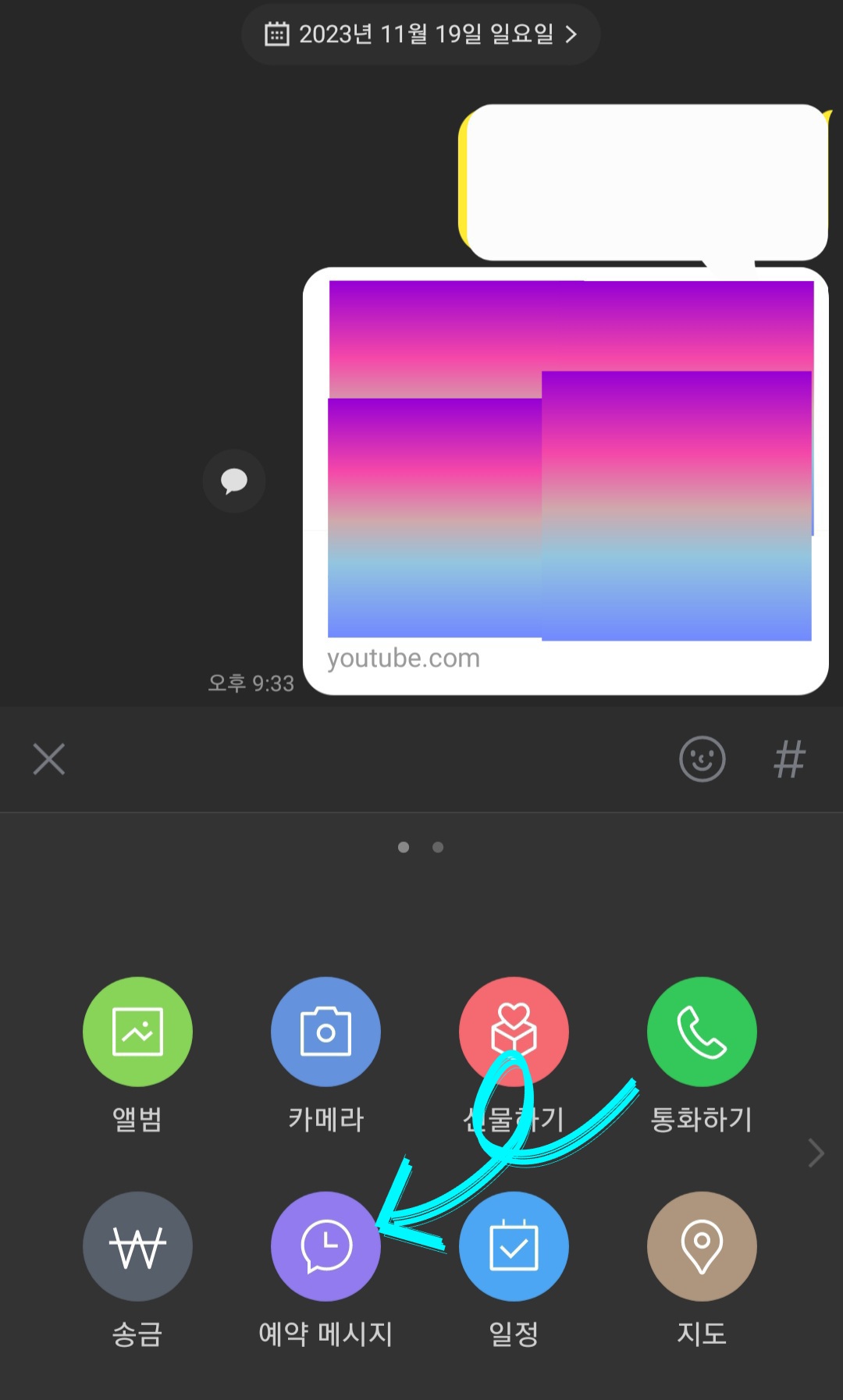 ▼그다음 채팅창 옆에 [+] 버튼을 클릭하면 다양한 기능들이 보일 겁니다. 그중[예약 메시지]을 클릭해 주세요.