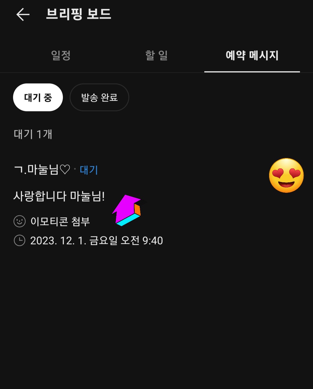 ▼저는 이모티콘을 이용해 와이프한테 "사랑합니다 마눌님"이라고 카카오톡 예약 메시지를 설정해보았습니다.