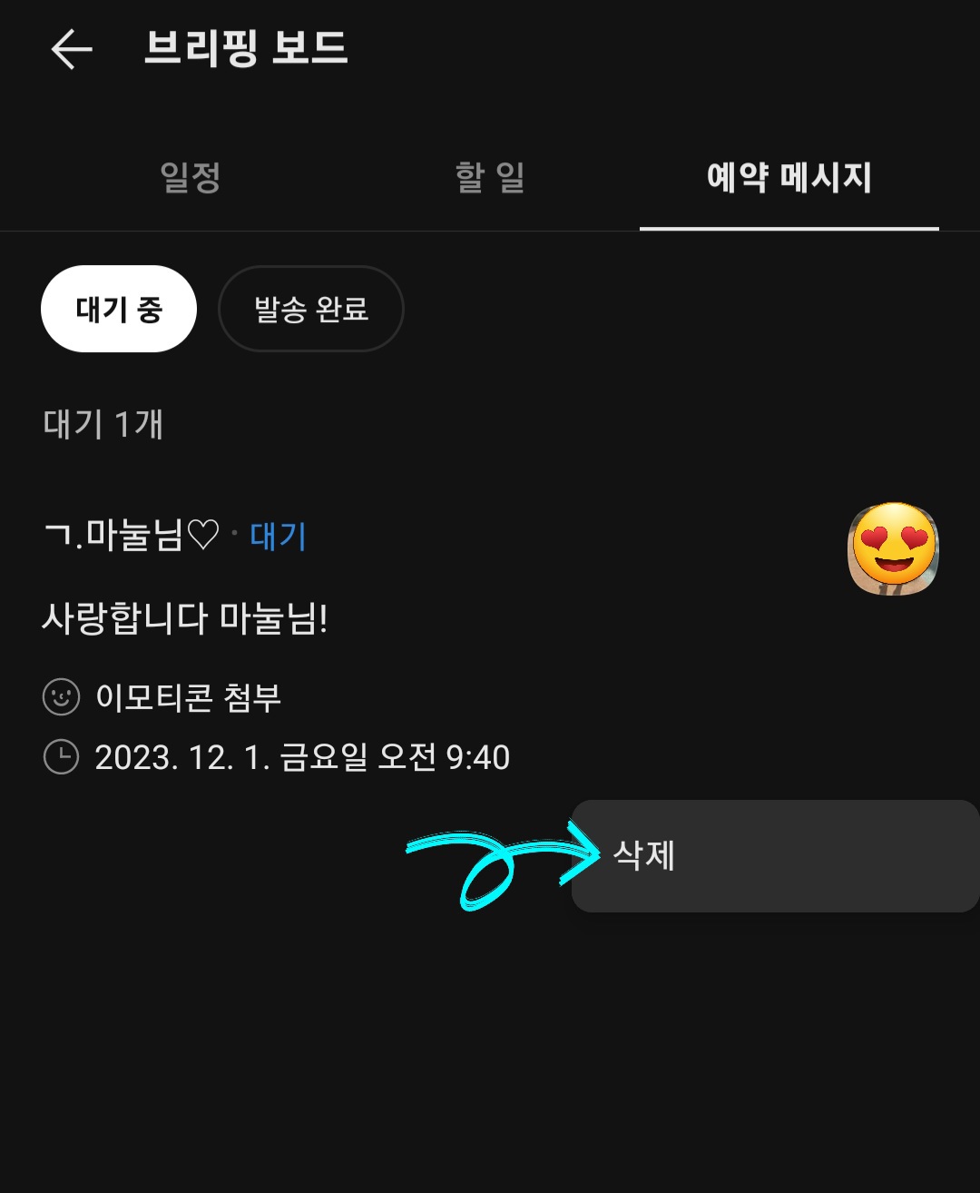▼만약 내가 보내고자 하는 예약 메시지가 잘못 설정되어 있어 삭제하고 싶다면 삭제하고자 하는 예약 메시지를 손가락으로 약 3초간 꾹 눌러준 다음 삭제를 클릭해 주면 됩니다.