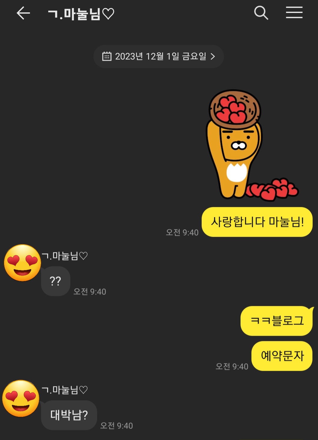 ▼저는 카카오톡 예약 메시지를 삭제를 안하고 그냥 뒀는데요. 정말 내가 설정한 이모티콘과 예약 메시지가 정확히 9시 40분에 와이프한테 보내지는 걸 확인할 수 있었습니다.
