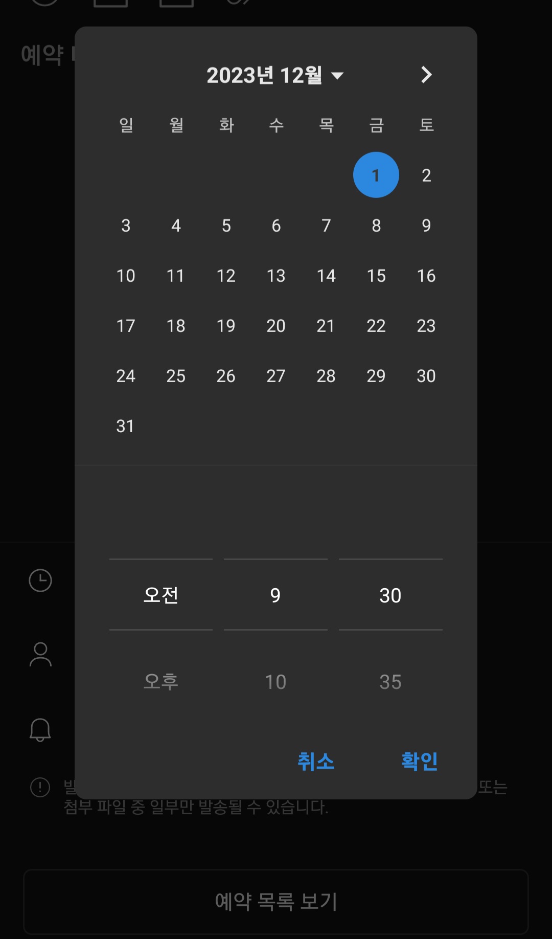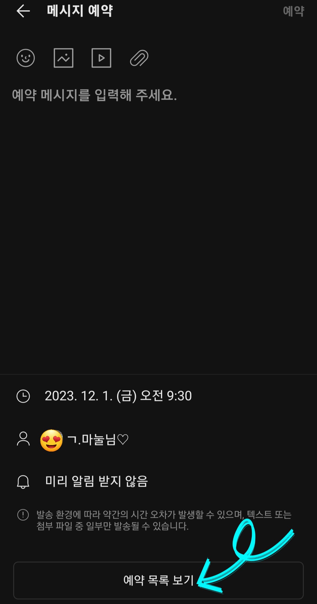 ▼그리고 하단에 시계모양 라인을 클릭하면 달력이 하나 뜰겁니다. 그럼 원하는 날짜 및 시간을 선택해 준 뒤 예약메시지를 작성하면 끝!
