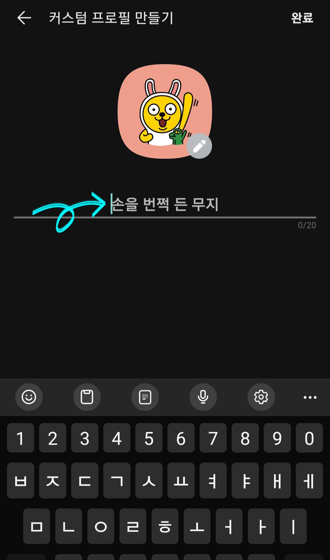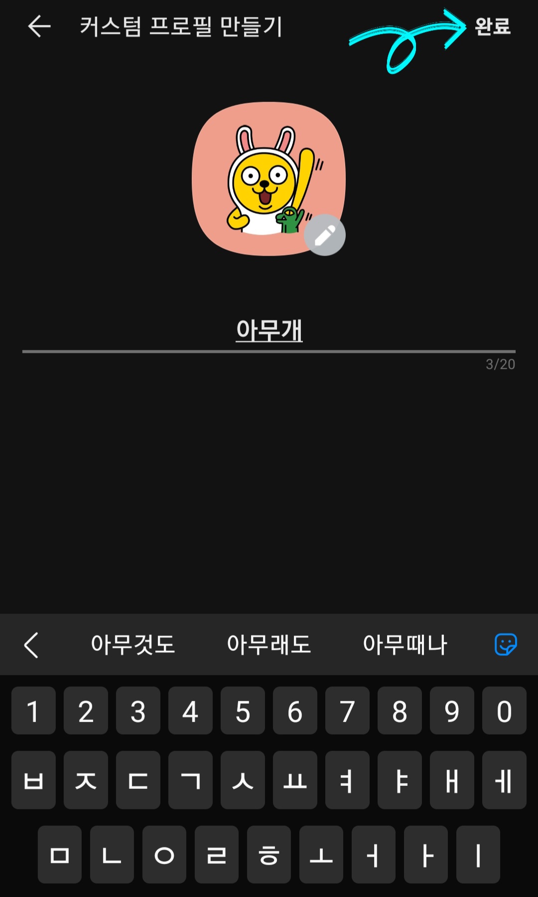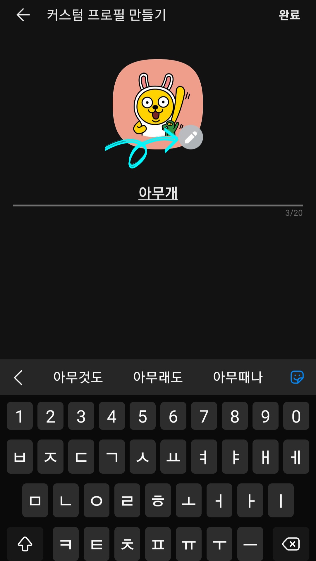 ▼그다음 원하는 이름으로 바꿔주면 되는데요. 그리고 만약 기본 설정되어 있는 프로필 카카오프렌즈 이미지가 마음에 안 든다면 [연필모양]을 클릭해줍니다.