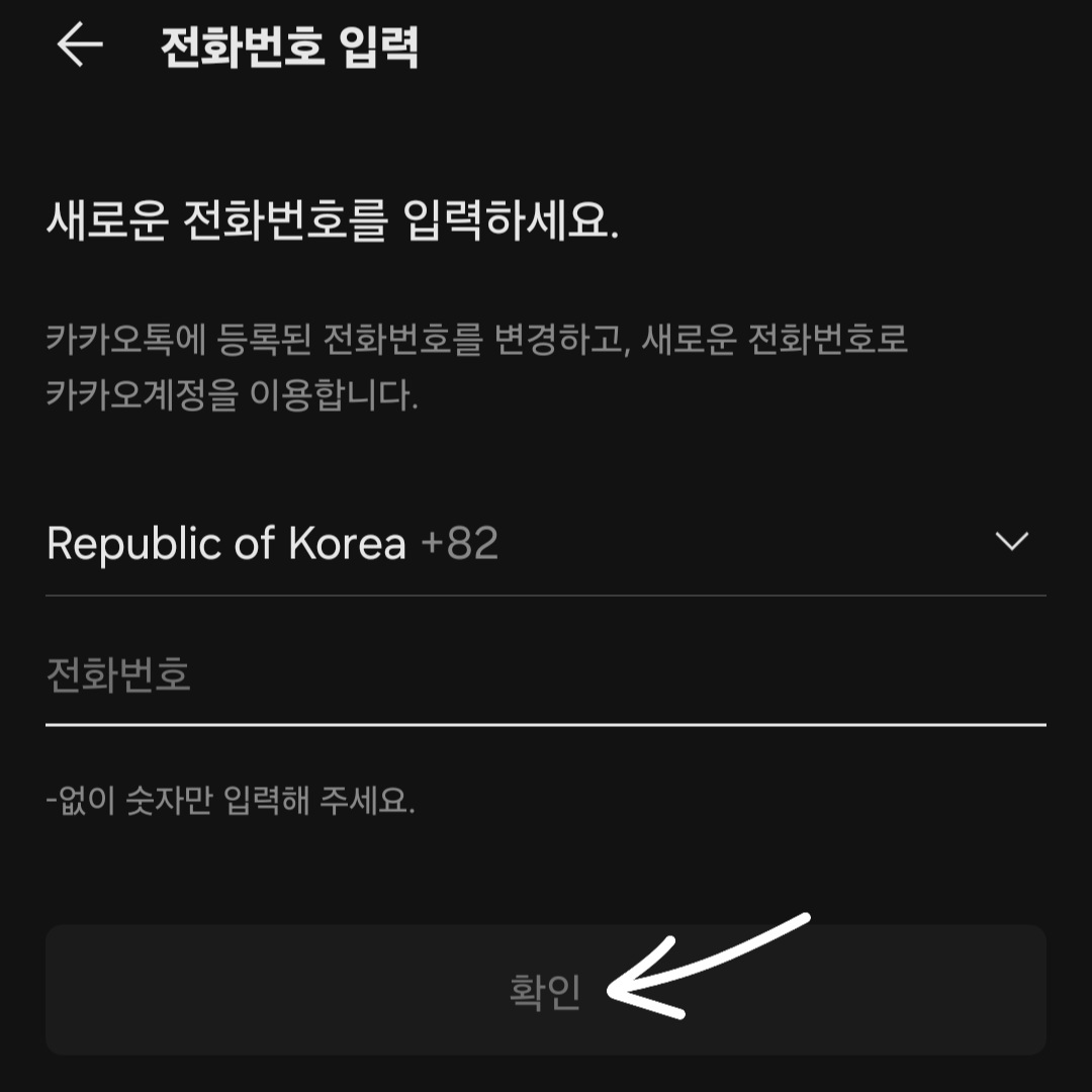▼그다음 현재 사용 중인 카카오계정 비밀번호를 입력 후 바뀐 전화번호를 입력하고 확인을 클릭하면 간단한 전화번호 인증과 함께 카카오톡 전화번호가 변경됩니다.