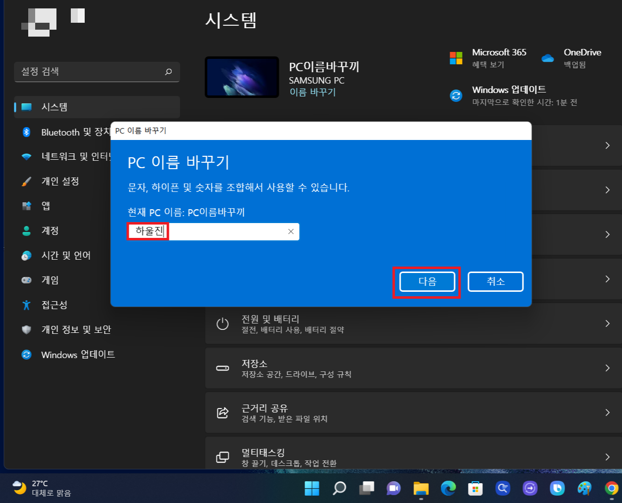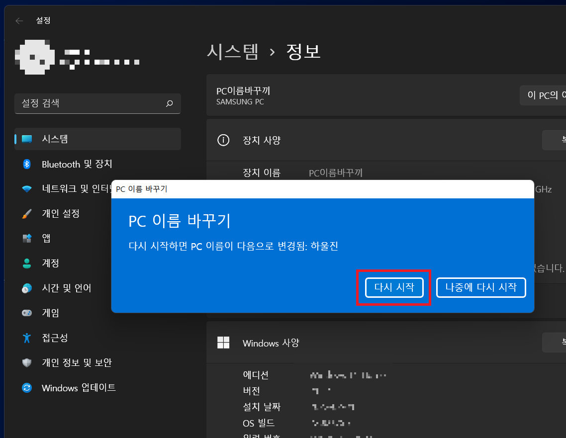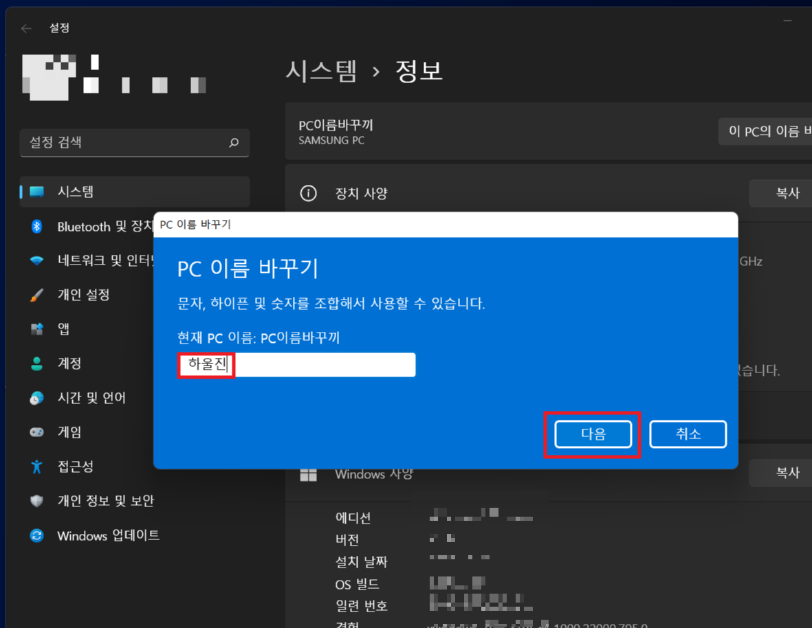 ▼그다음 설정하고 싶은 이름을 작성 후 [다음]을 클릭해 [재부팅]해주기만 하면 됩니다.