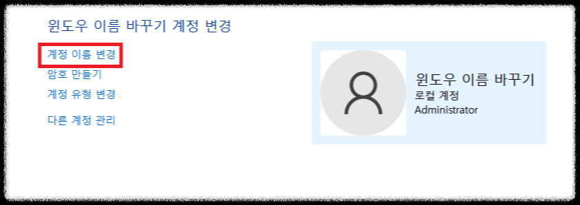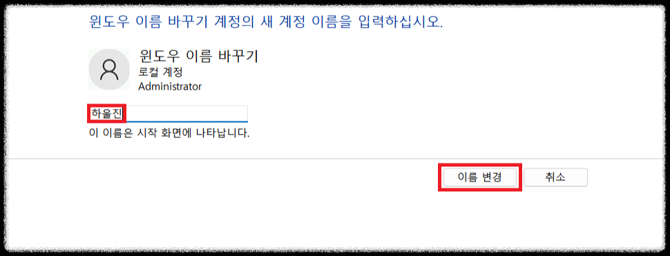 ▼그다음 [계정 이름 변경]을 클릭 후 기존에 바꾸고 싶었던 사용자 계정 이름으로 바꾼 다음 [이름 변경]을 클릭해주면 됩니다.