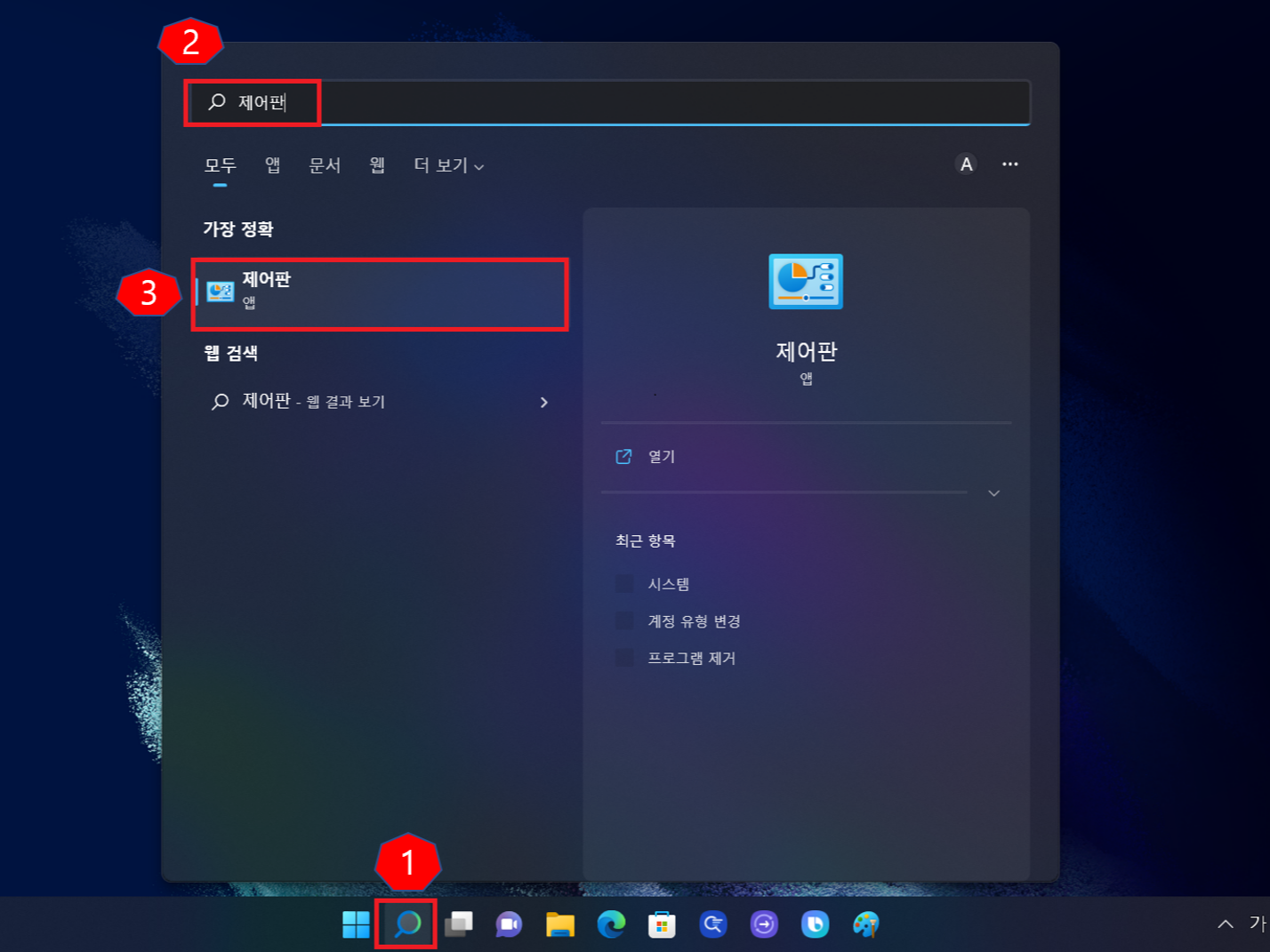 ▼[윈도우 검색창]을 클릭한 다음 검색창에 [제어판]이라고 작성 후 [제어판 앱]을 실행해줍니다.