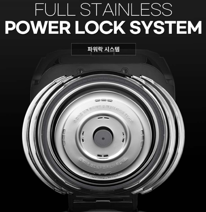 거기에 파워락 시스템까지 적용해 옆으로 김이 새는걸 파워 압착 패킹이 잡아주고 상부 플레이트와 내솥을 강하게 밀착시켜 파워 압착 패킹이 내솥 위아래 초밀착해주기 때문에 잠금 체결 면적이 넓어져 김샐 틈 없어 121도로 올라가는데 파워 압착 패킹이 도와준다고 합니다.