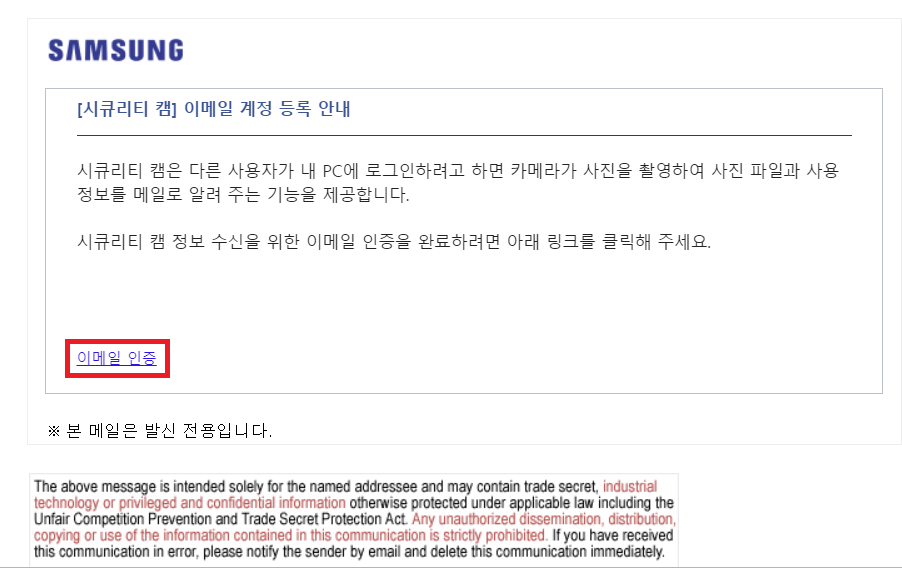 그다음 등록한 이메일에 로그인 한 다음 메일을 확인해보면 시큐리티 캠에 관한 메일이 왔을 겁니다. 그럼 이메일 인증만 해주면 시큐리티 캠 기능이 활성화됩니다.