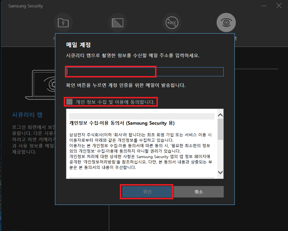 그럼 간단하게 시큐리티 캠에 대해서 설명을 해주는데 한번 읽어준 다음 확인을 클릭하고 이메일 등록, 개인정보 동의 클릭하고 확인을 클릭을 해줍니다.