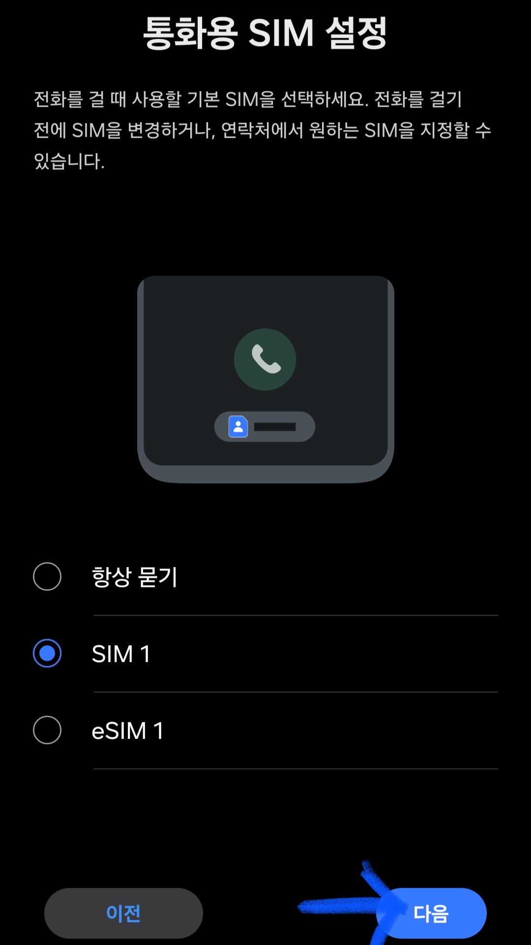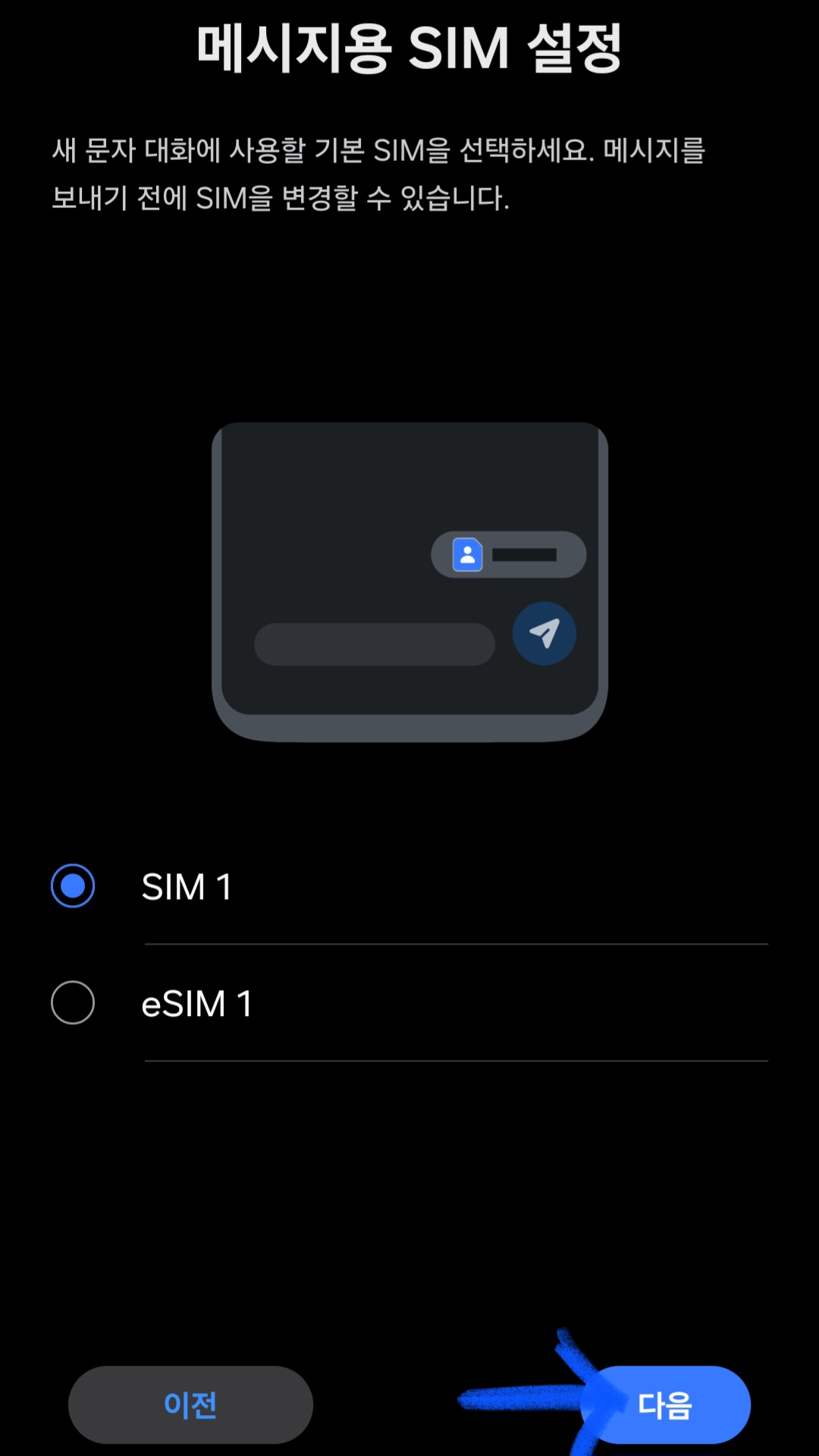 ▼그다음 통화용 SIM 설정은 SIM1으로 설정, 메시지용 SIM 설정 또한 SIM1으로 설정해 줍니다.