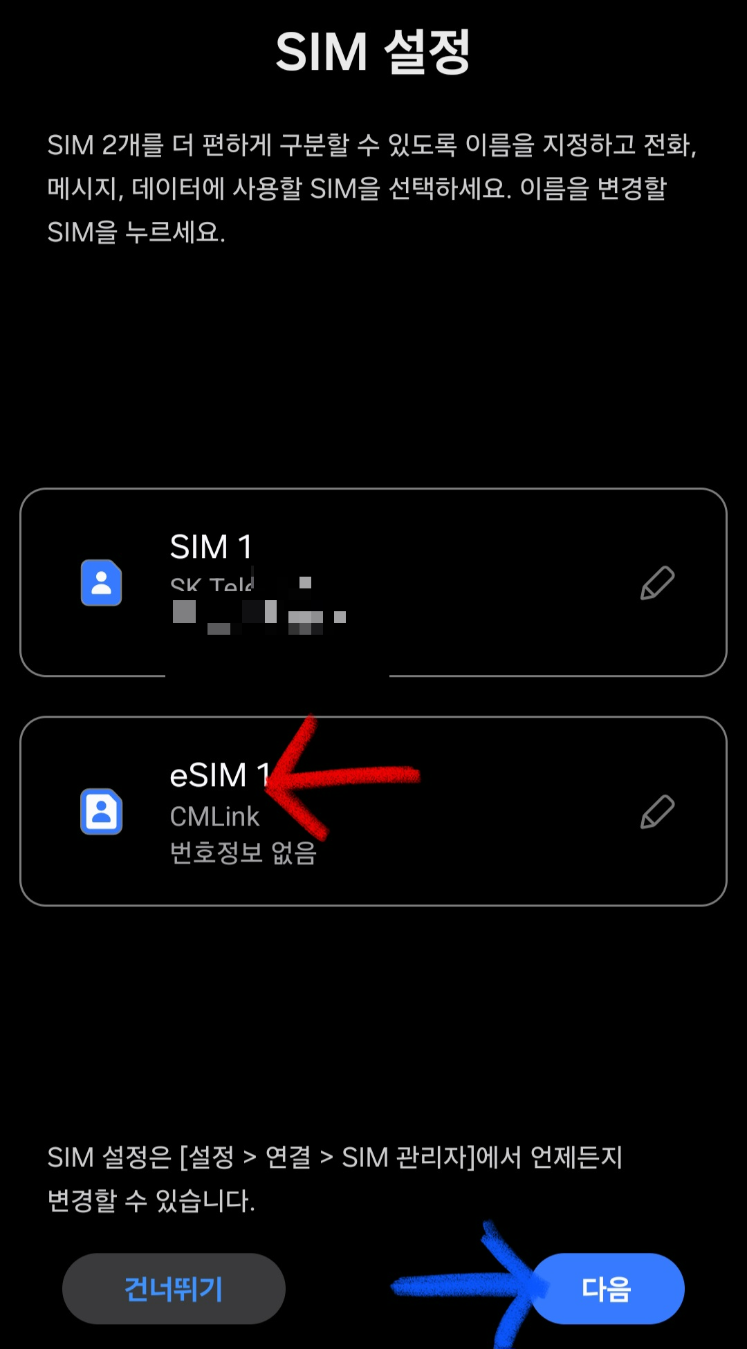 ▼그렇게 QR코드를 핸드폰으로 인식하면 eSIM설정으로 넘어가집니다. 그럼 밑에 있는 이미지 사진처럼 [추가]를 클릭 후 [eSIM 1]를 클릭하고 [다음]으로 넘어가주세요.