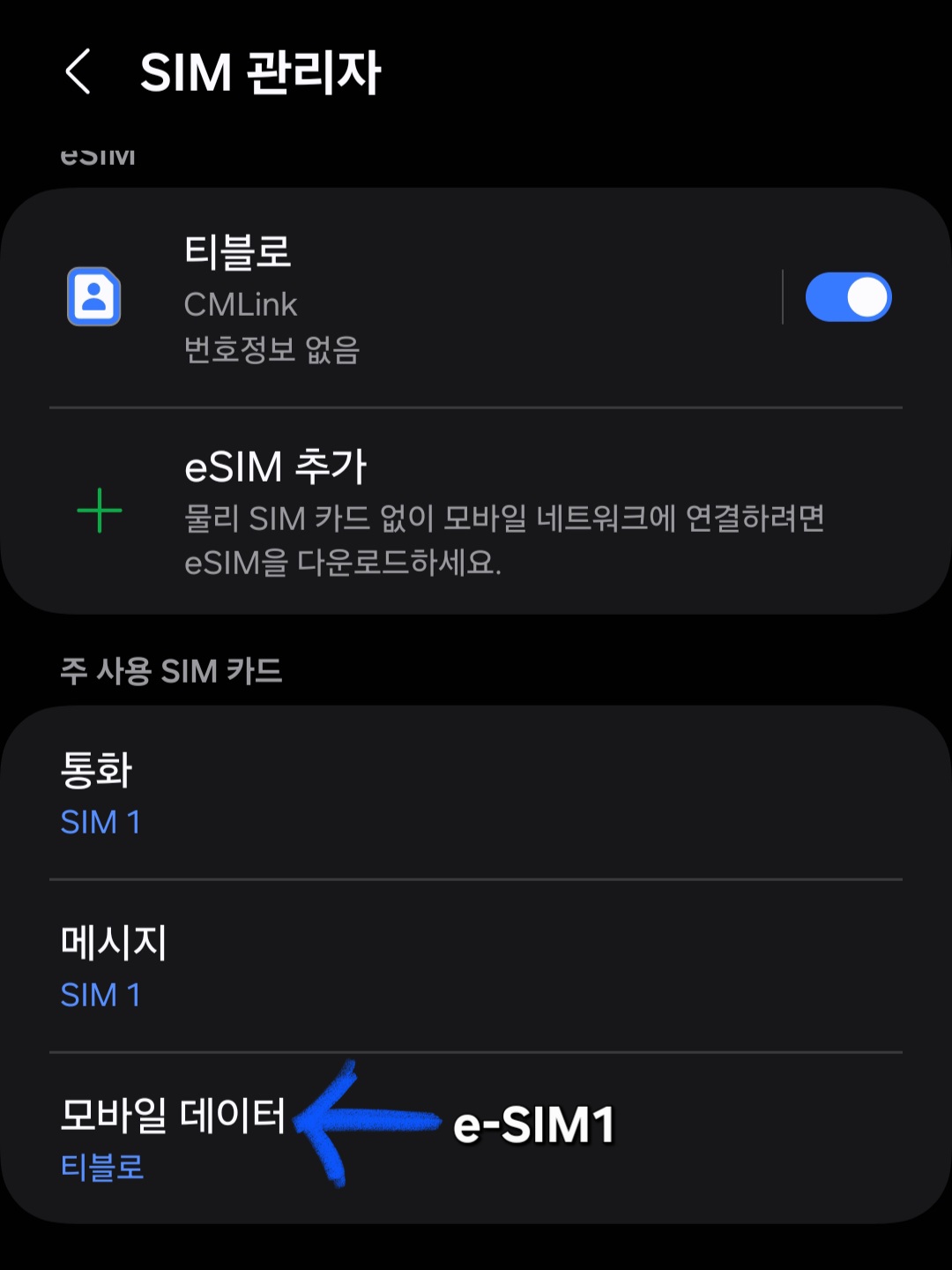 ▼마지막 데이터용 SIM 설정은 eSIM1으로 설정해주기만 하면 끝 이 설정은 해외 가기 전 미리 설정해주기만 하면 됩니다.