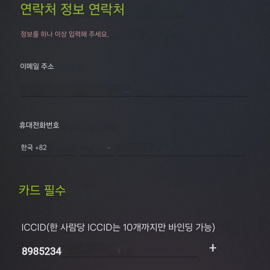 ▼그다음 이메일 주소, 휴대전화 번호를 입력 후 ICCID을 입력해 줍니다. ICCID 번호는 eSIM설정하기 전 QR코드에 쓰여있으니 참고 바랍니다.