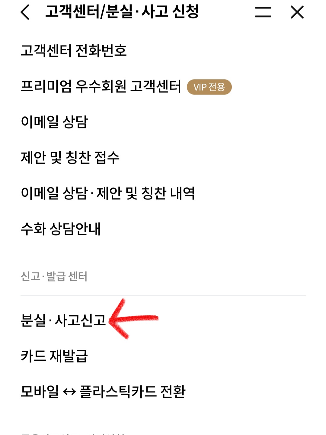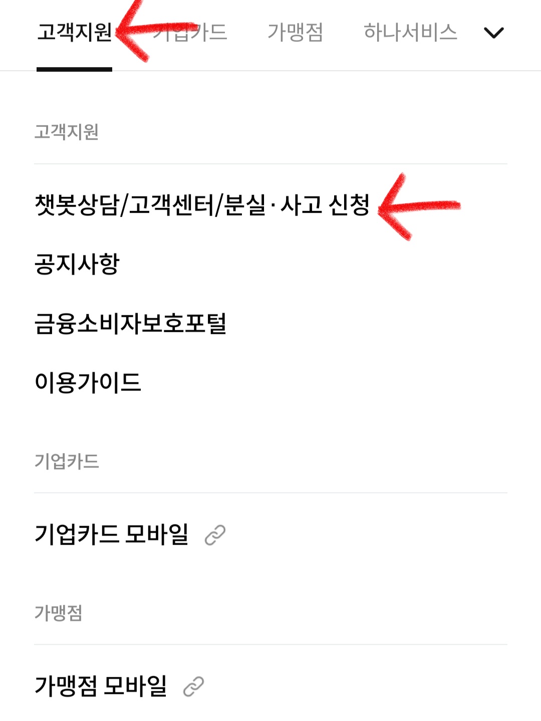 ▼그다음 아까랑 동일하게 [고객지원] 란에서 [챗봇상담/고객센터/분실•사고 신청]를 클릭하고 [분실•사고신고]를 클릭해 주면 되는데요.