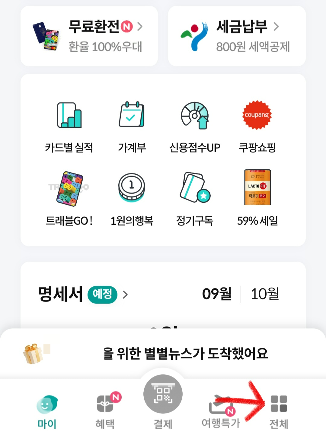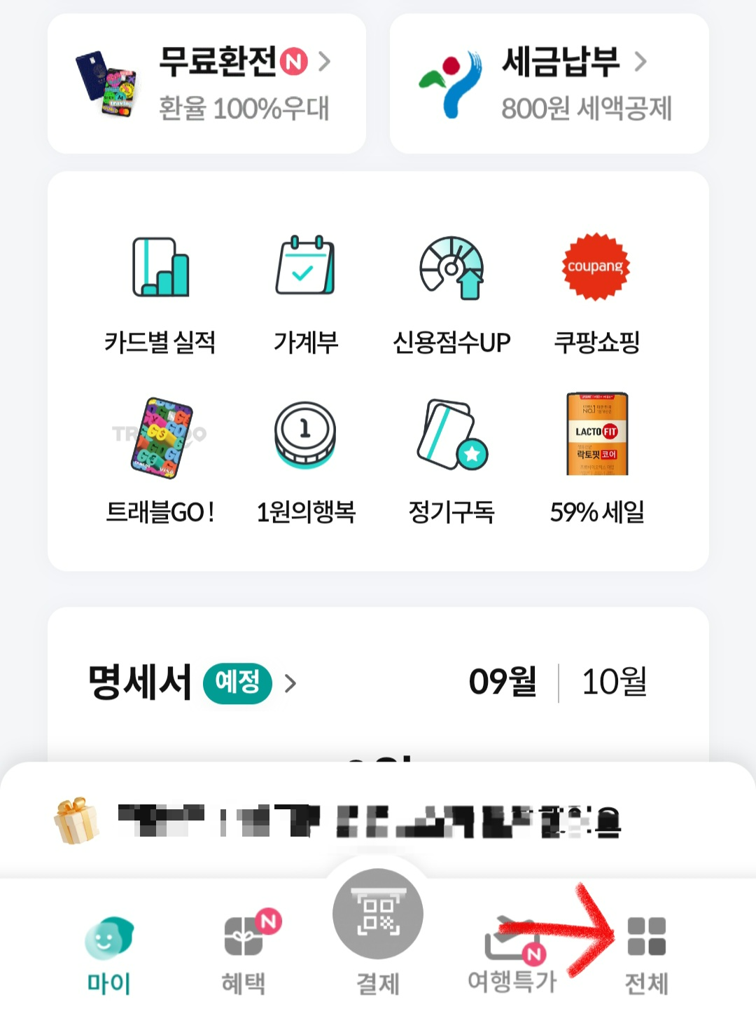 ▼만약 잃어버린 카드를 찾았다면 분실신고 해제를 해줘야하는데요. 하나카드 분실신고 해제하는 방법 또한 앱으로 간단하게 할 수 있습니다. 분실신고 할 때랑 똑같이 [하나카드앱]을 실행 후 하단에 있는 [전체] 클릭해 줍니다.