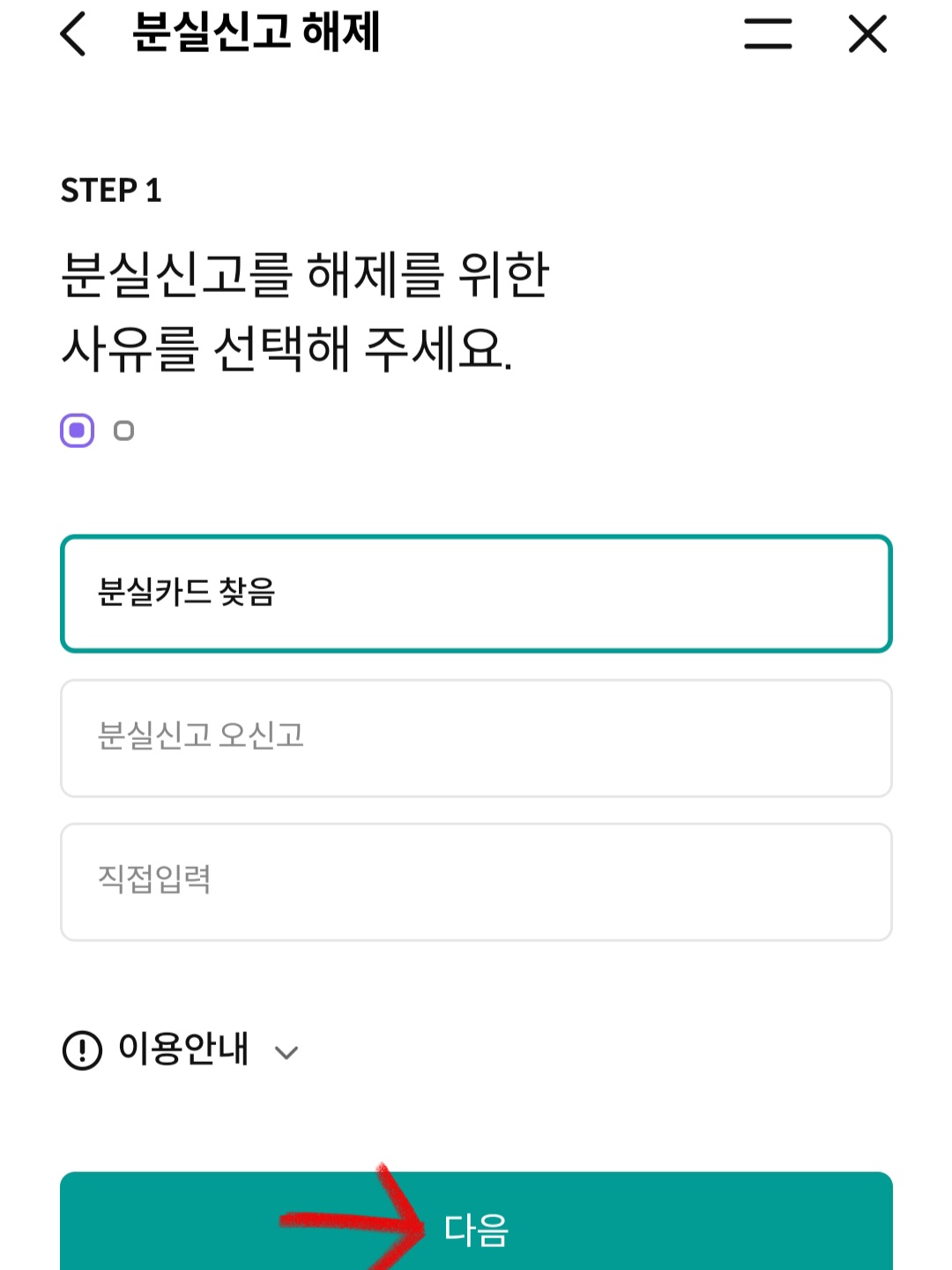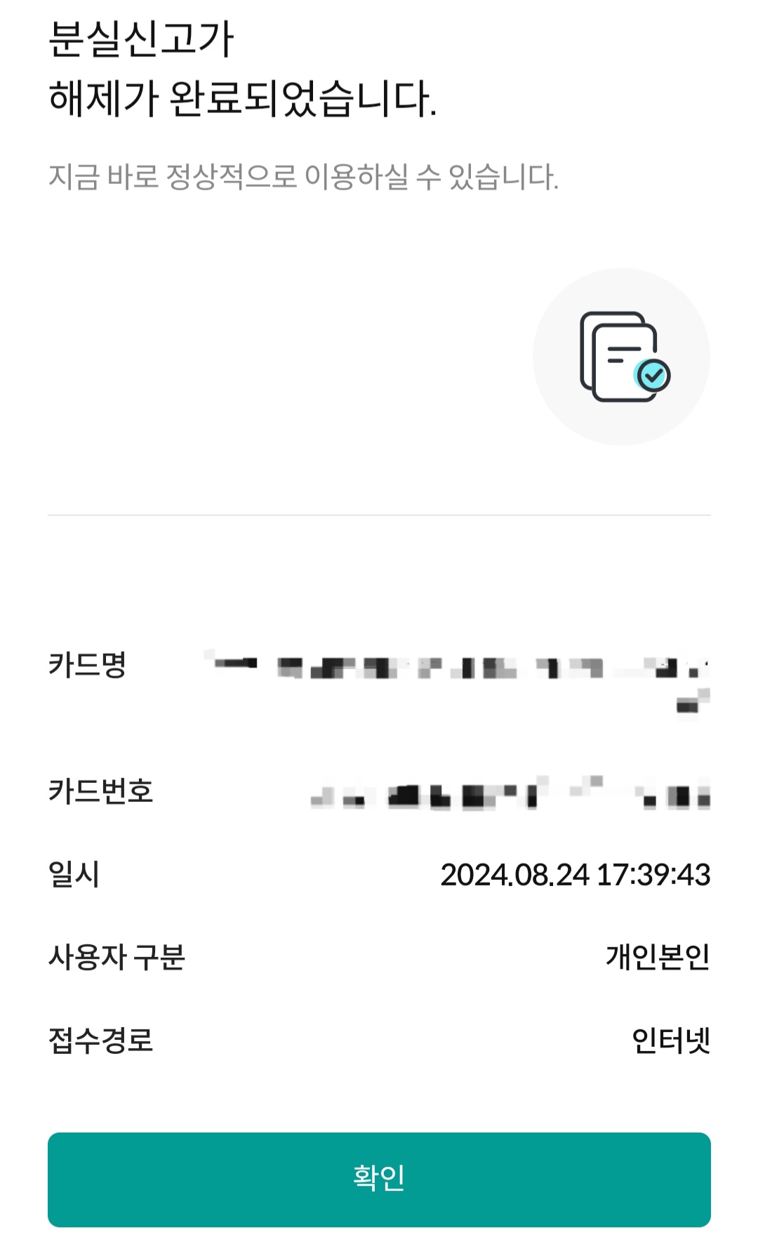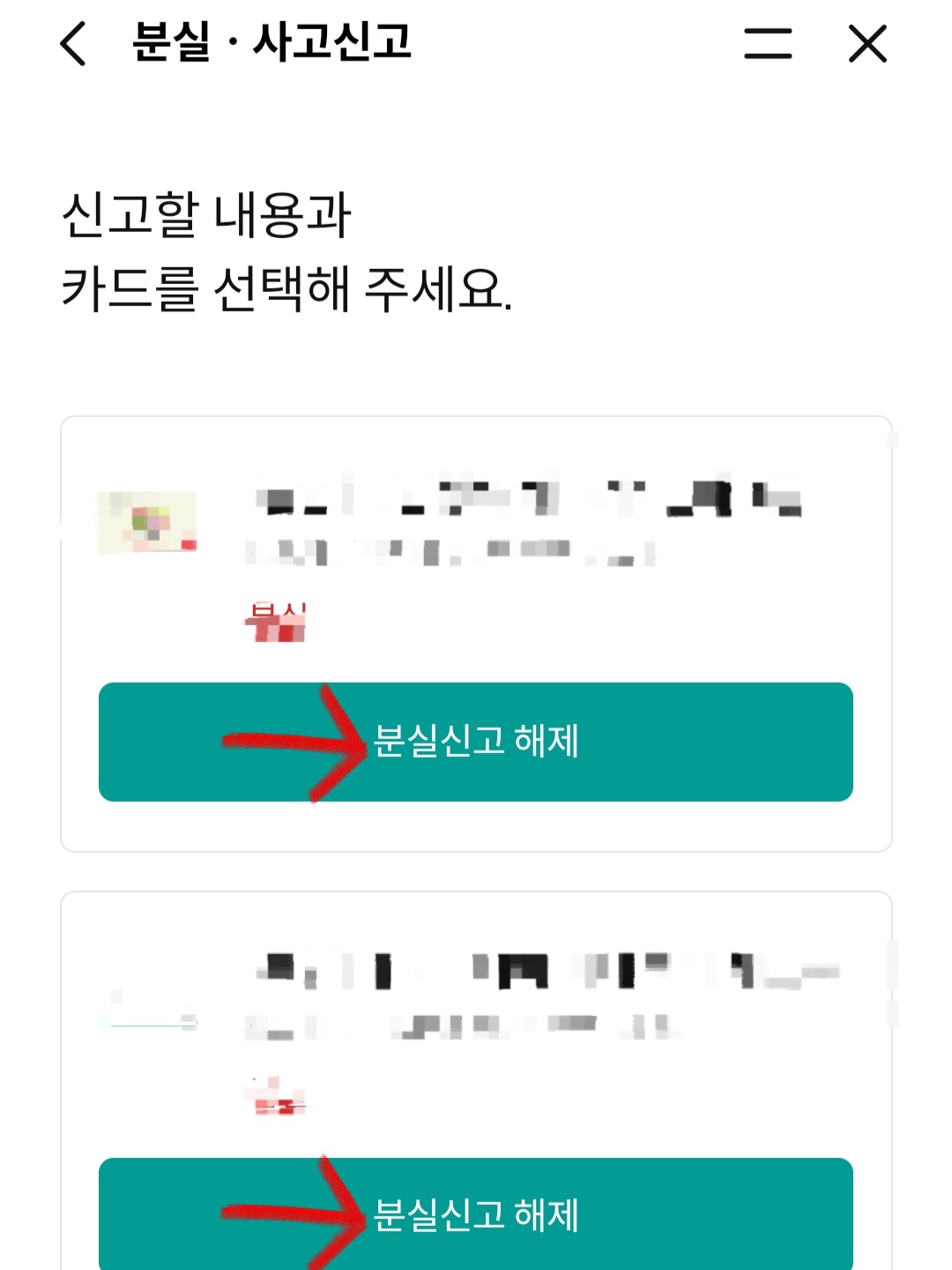 ▼그럼 아까랑은 반대로 [분실신고 해제] 란이 뜰 겁니다. 그걸 클릭 후 절차에 따라 진행만 해주면 분실신고 해제와 함께 다시 카드를 사용할 수 있게 됩니다.