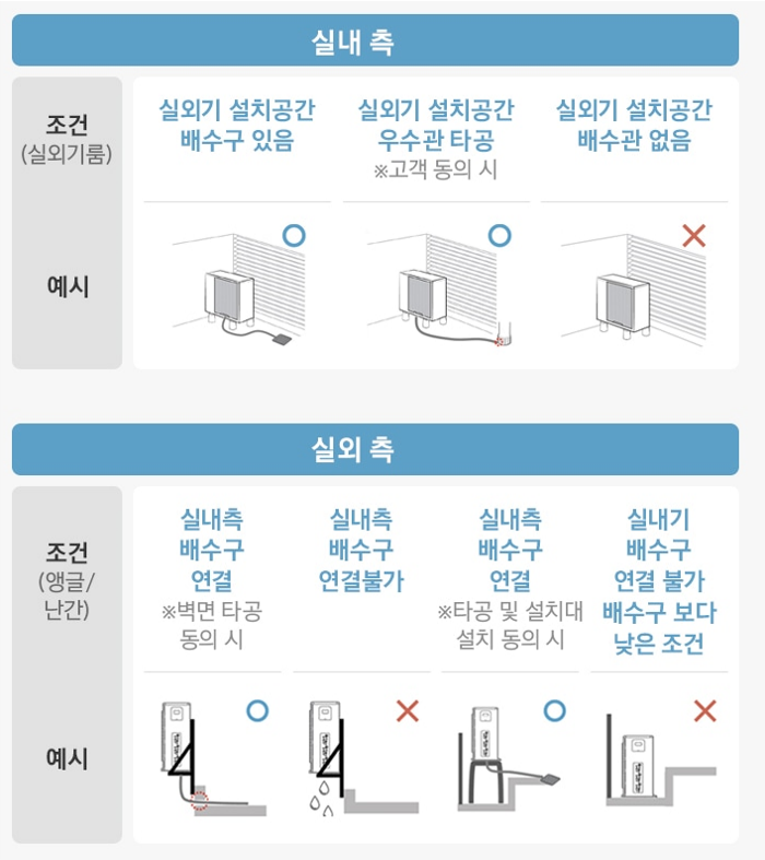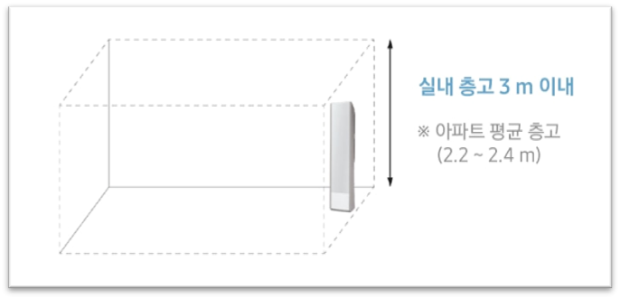 삼성 무풍 갤러리 체온풍 제품은 설치 조건이 일반 가정용 에어컨에 비해 조금 까다로운 것 같습니다. 우선 에어컨 설치 공간의 높이가 3m 이하 공간에만 설치가 가능하고 3m 이상 층고의 사무실, 상가, 교회 등은 설치가 불가하다고 실외기에서 발생하는 응축수 배출이 필요해 배수호스로 연결하여 배수 홀로 자연 배수가 가능한 경우에만 설치가 가능하다고 합니다.