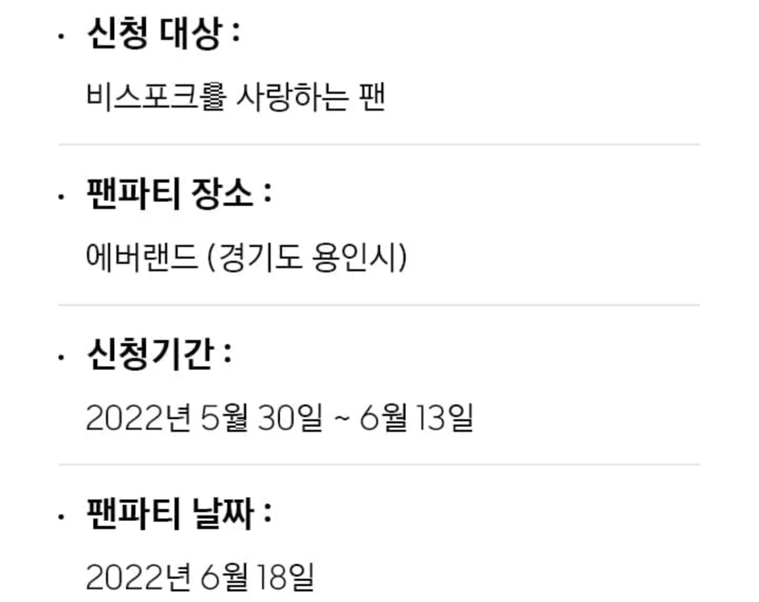 참여 방법은 위에 있는 이미지처럼 간단합니다. 우선 삼성 비스포크를 사랑하는 분들이면 참여가 가능하고 팬 파티 장소는 경기 용인시 에버랜드에서 한다고 합니다. 신청시간은 2022년 5월 30일 ~ 6월 13일까지이며 비스포크 팬파티 날짜는 2022년 6월 18일에 한다고 합니다.