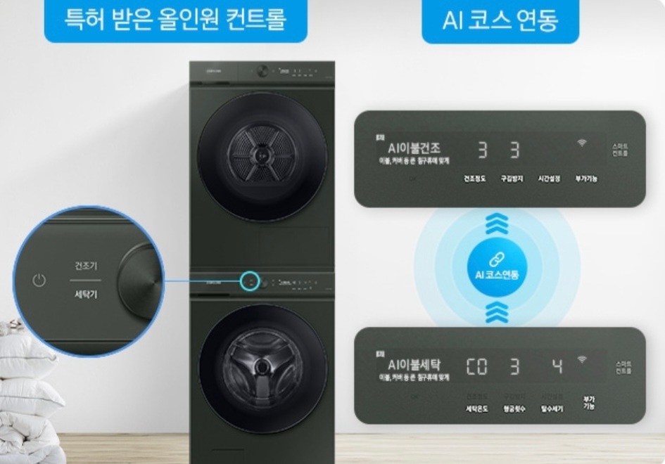 간단하게 설명해드리자면 특허받은 올인원 컨트롤 기술로 직렬 설치 시 세탁기랑 건조기가 연동되어 앞서 설명해드렸던 코스를 알아서 세팅을 해주고 세탁기 버튼에서 건조기 기능까지 조절할 수 있어 편리하게 사용할 수 있습니다