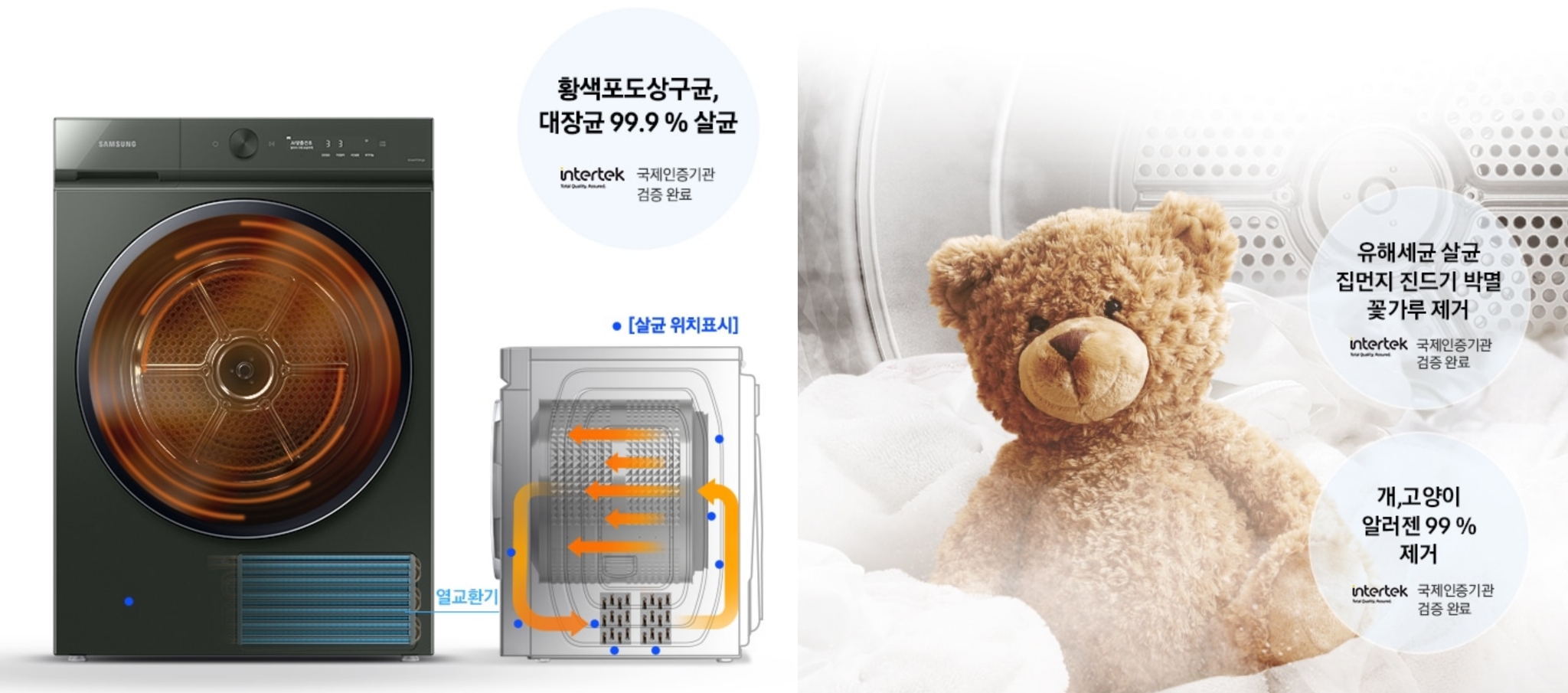 그 외에 기능으로 건조기 내부를 열풍 내부 살균 기능으로 혹시 모르는 습기를 제거해주고 살균 건조 코스로 유해세균, 집먼지 진드기, 꽃가루, 알러젠 제거까지 해주는 건조기입니다.