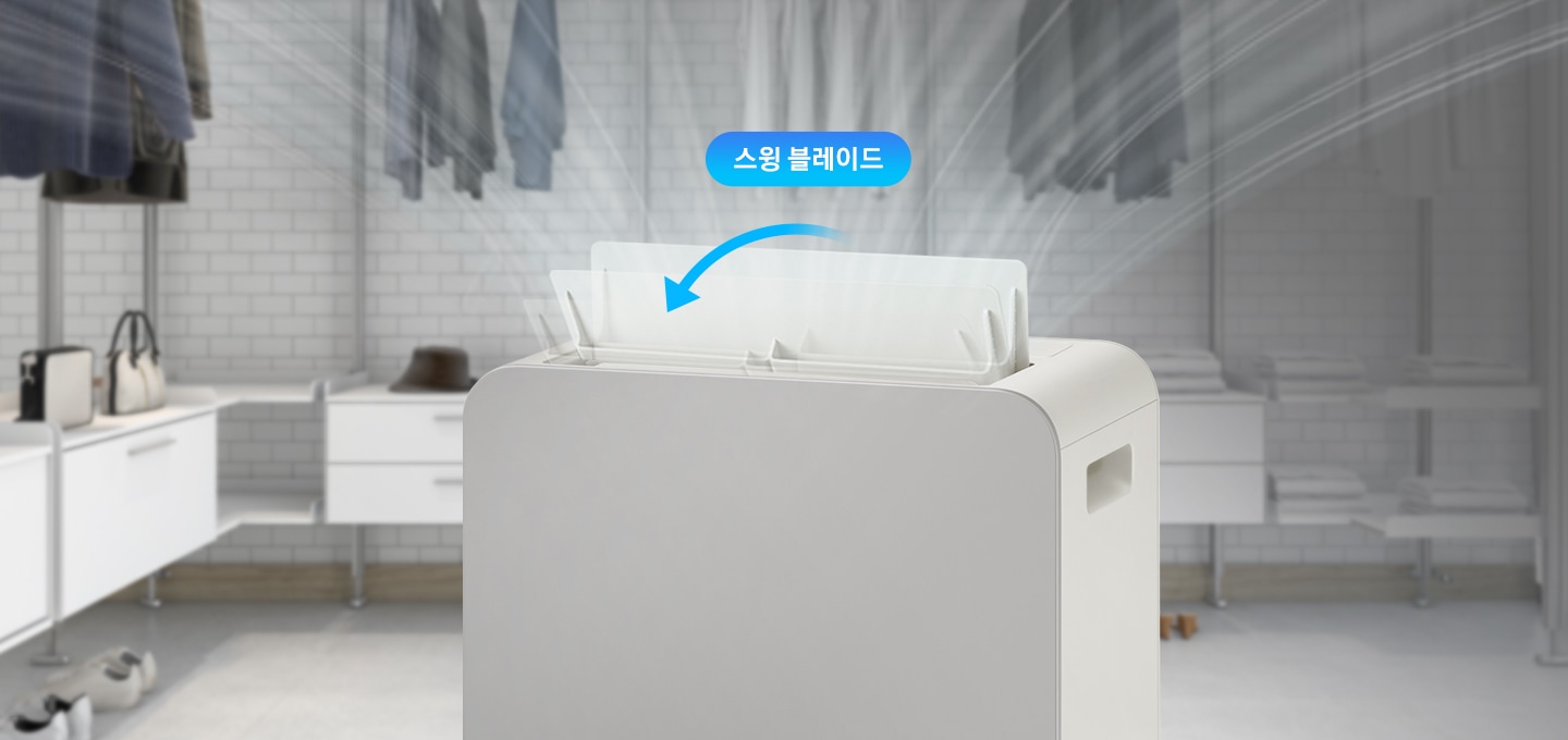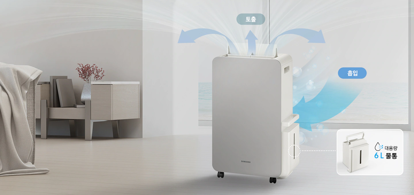 삼성 인버터 제습기 하루 제습량은 18L로 500ml 생수로 따지자면 36개의 분량의 제습을 해주는 인버터 제습기입니다. 거기에 넓게 구성된 와이드 토출구와 스윙 블레이드로 습기진 곳을 구석구석 빠르게 제거해주고 6L의 대용량 물통을 적용해 물통을 자주 비울 필요 없이 대용량의 제습이 가능합니다.