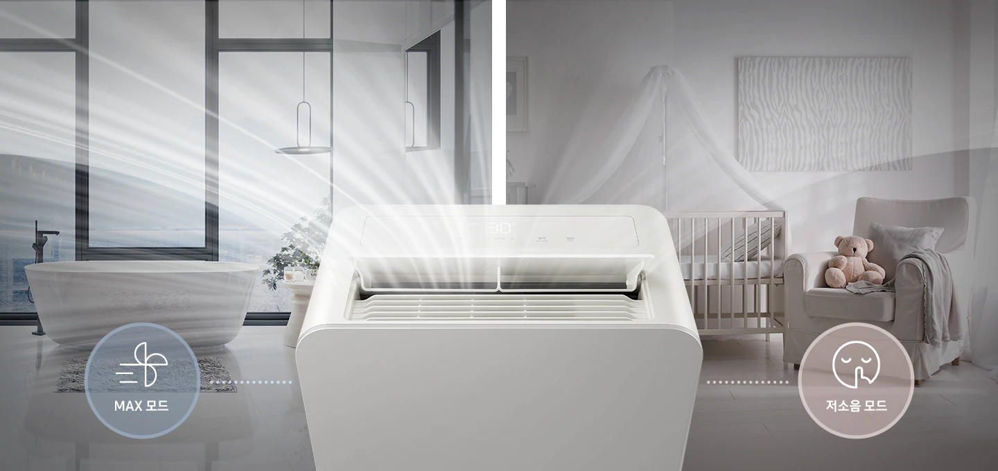 삼성 인터버 제습기 제습 모드 중 습기를 빠르게 빨아들이기 좋은 Max 모드와 어린아이가 자고 있어 조용하게 제습기를 하고 싶을 때에는 저소음 모드 그리고 기계치라 삼성 인버터 제습기 사용법을 잘 모르겠다면 어떠한 공간도 알아서 최적의 습도로 맞춰 제습해주는 스마트 모드가 있습니다. 그리고 덥고 습한 거나 장마 시간 그리고 빨래가 잘 마르지 않을 때는 의류 건조 모드로 사용 시 섬세한 의류 건조 또한 가능한 제품입니다.