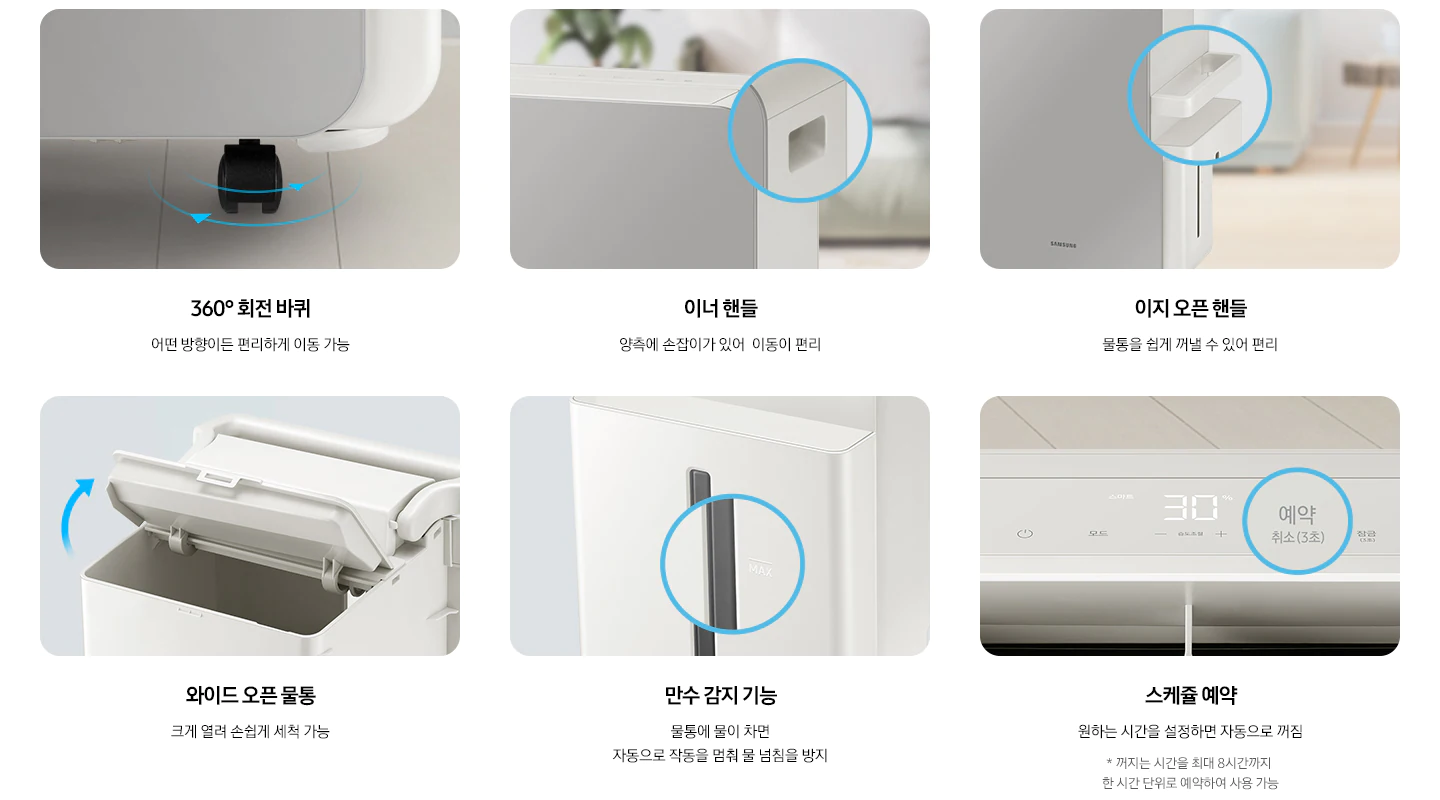 삼성 인버터 제습기 역시 360도 회전 바퀴와 양측 이너 핸들로 양측에 손잡이가 있어 거실 안방 혹은 화장실까지 이동이 편리하고 만수 감지 센서 기능으로 물이 가득 차면 자동으로 제습기가 자동을 멈출 뿐 아니라 와이드 오픈 물통으로 가득 찬 물을 버릴 때 편리하고 물통 입구가 크게 열려 손쉽게 세척도 가능합니다. 거기에 스케줄 예약 기능으로 원하는 시간을 설정하면 자동으로 꺼지는 기능도 있습니다.