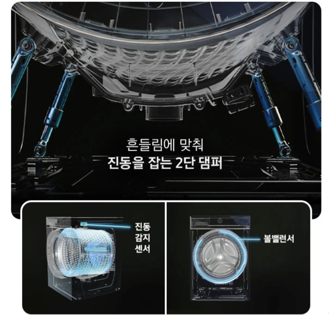 업그레이드된 2단 댐퍼와 드럼의 진동을 잡아주는 볼랜런서 및 진동을 감지하고 제어하는 진동 감지센서로 세탁기 진동과 소음이 절반으로 더 조용한 세탁이 가능해졌다고 합니다. 물론 집 환경에 따라 달라질 수 있겠지만 당사 실험 기준으로 22년 세탁기 제품은 진동폭이 양 옆으로 0.07mm 흔들렸다면 이번에 출시한 비스포크 그랑데 원바디 Top-Fit은 세탁기 진동폭이 양 옆으로 0.03mm로 흔들림이 줄었다고 합니다.