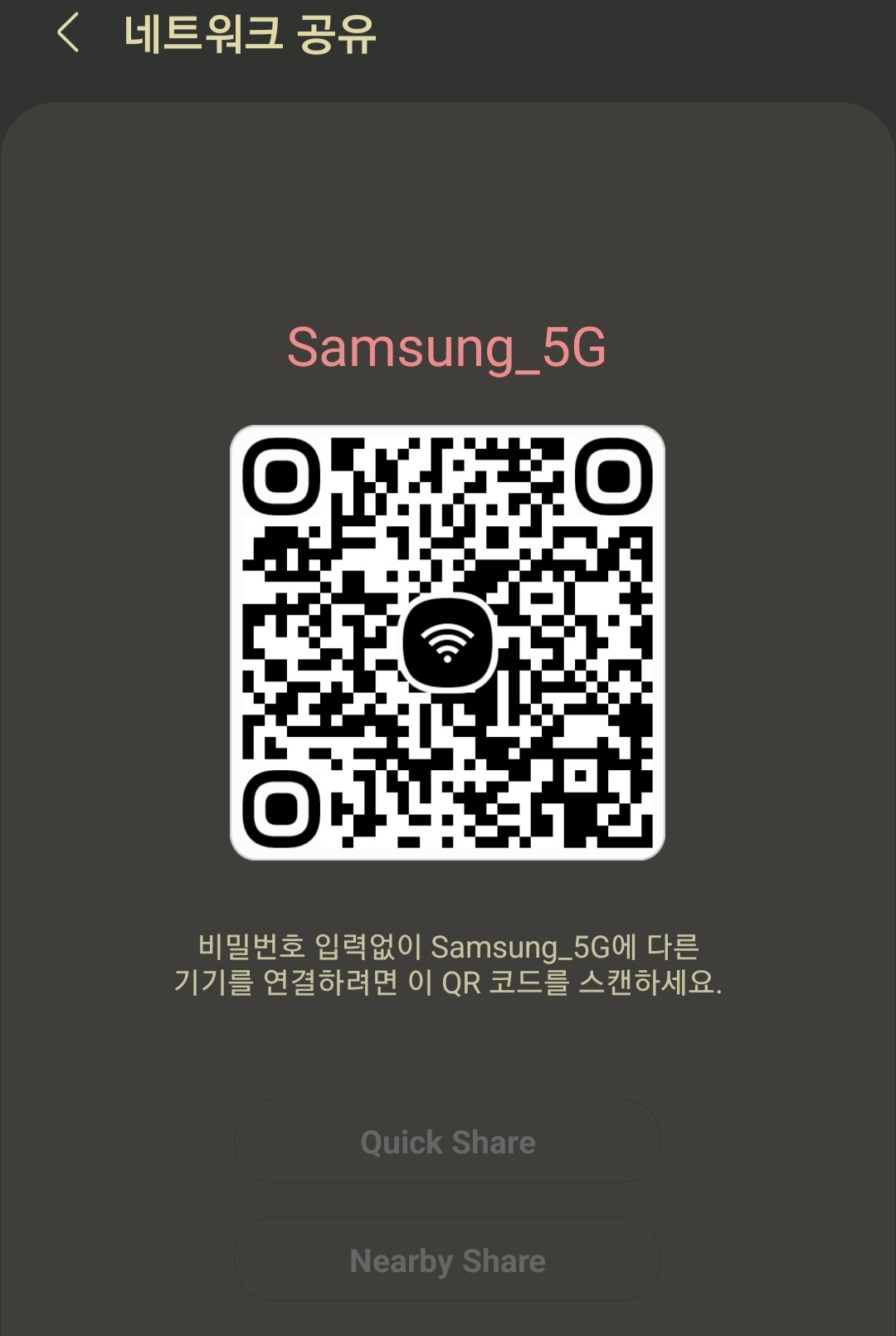 그럼 비밀번호가 걸려있는 와이파이도 그냥 잡아주기 때문에 지인이 비밀번호 걸려있는 와이파이를 사용 중인데 나도 쓰고 싶다면 지인 스마트폰으론 QR코드를 만들고 내 스마트폰 스캔만 해주기만 하면 비밀번호를 설정하지 않아도 와이파이를 사용할 수 있습니다.