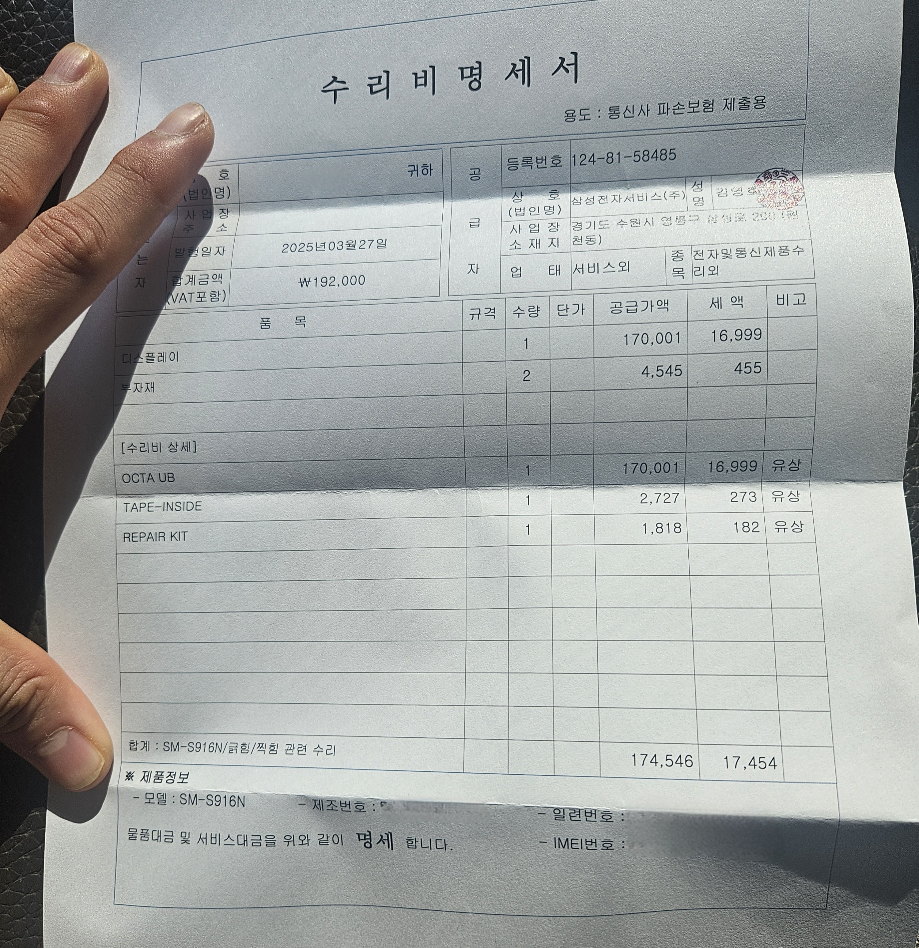 그리고 파손보험 제출용으로 요새는 수리비명세서도 같이 뽑아서 주더라고요. 파손보험을 든 기억이 없어서 사진 찍고 바로 버렸답니다.