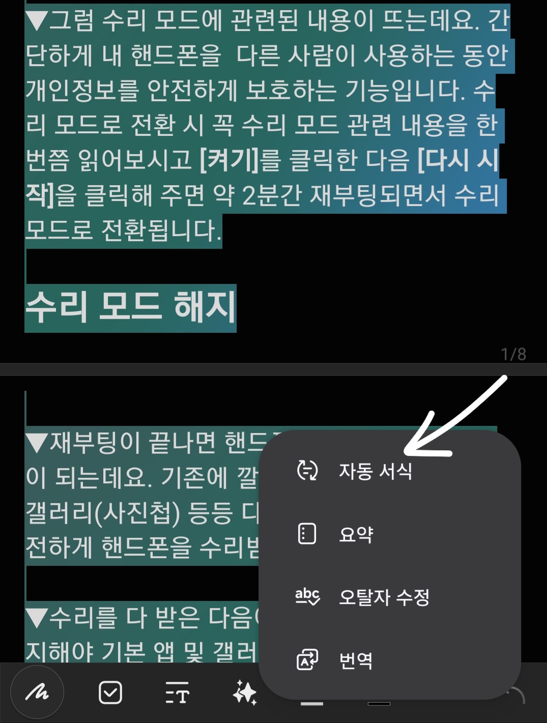 ▼그 외 삼성 노트의 새로 생긴 자동 서식 기능을 사용하면 [제목 및 글머리 기호], [회의 노트] 형식의 텍스트로 바꿔주는 기능도 생겼으니 한번 사용해 보시길 바랍니다.